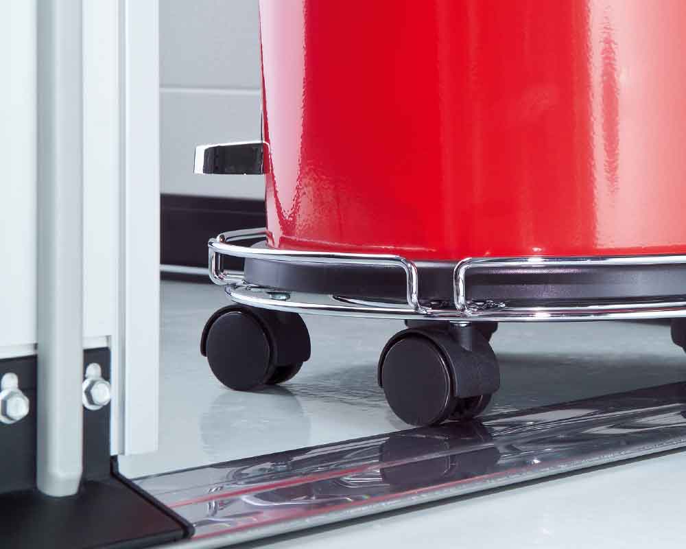 Die sehr flache Edelstahlschwelle mit abgerundeten Kanten kann mit Werkzeugwagen oder Transportkarren leicht überfahren werden.