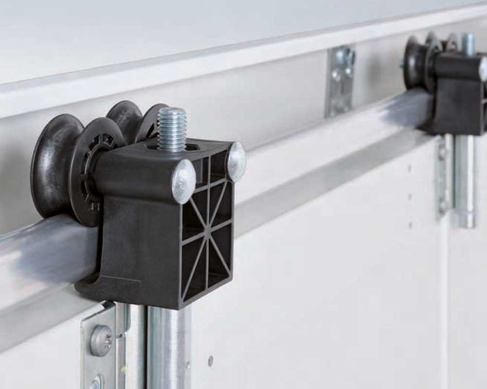Die 42 mm dicken PU-ausgeschäumten Paneele werden oben durch stabile doppelte Laufrollen und unten in einer abgerundeten Bodenschiene sicher und präzise geführt.