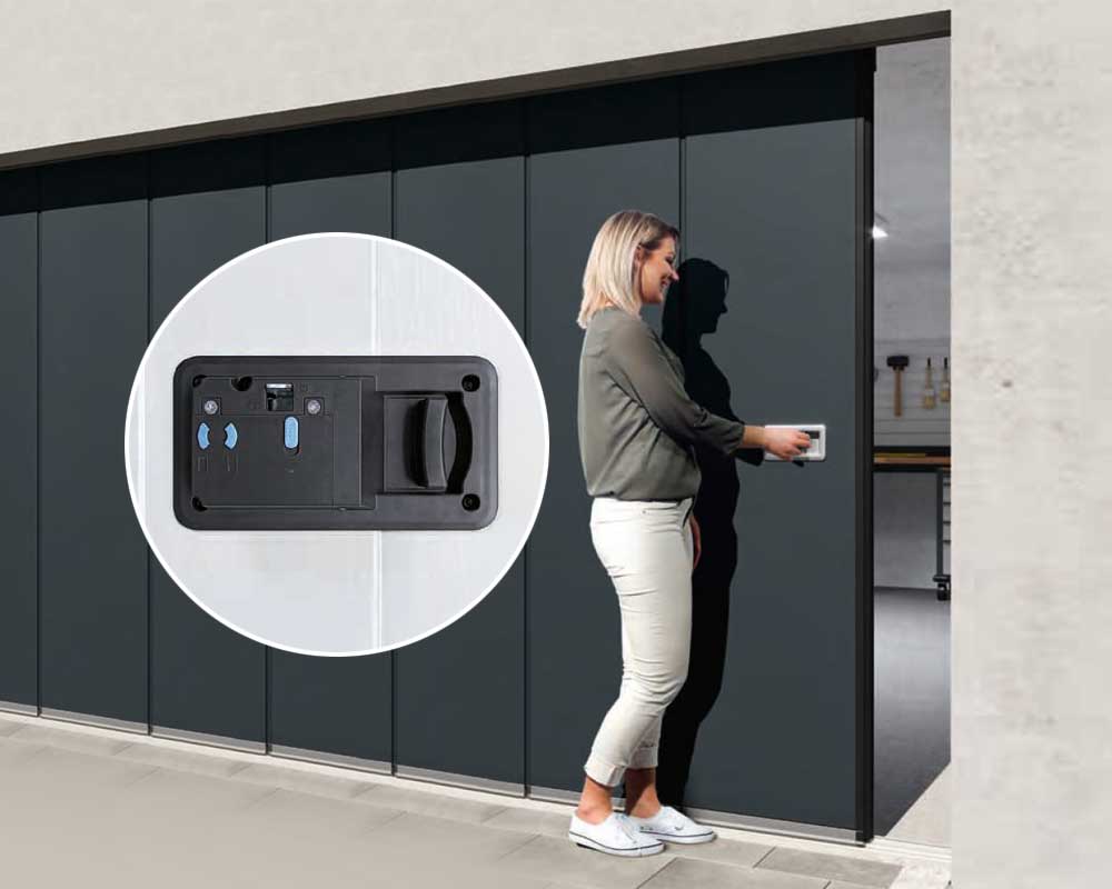 Mit einem Handsender oder dem Griff am Tor können Sie Ihr Seiten-Sektionaltor für den Personendurchgang schnell und einfach teilweise öffnen. Eine kurze Betätigung des Griffes und das Tor fährt automatisch in die eingestellte Position. Eine weitere Betätigung schließt das Tor wieder.