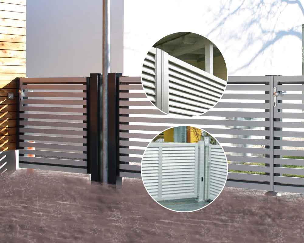 Brix-Lamellen, aus extrem stabilen Profilen, sind klar strukturiert; mit durchgehend gleicher Lamellenlinie in Zaun und Tor.